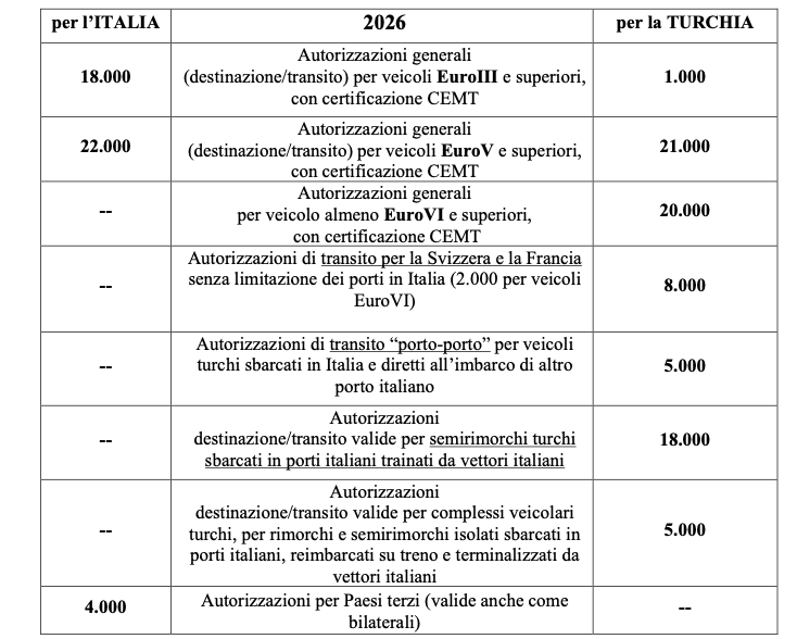 stato diminuito di 3.000 unità, mentre è rimasta invariata la quota di 5.000 permessi “porto a porto” per il transito in Italia di complessi veicolari turchi diretti in altri Paesi.